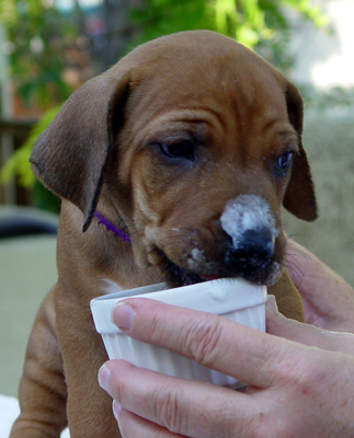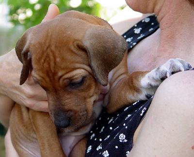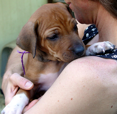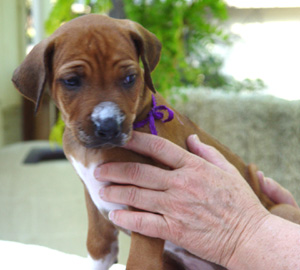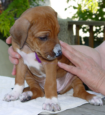 Armagh Rhodesian Ridgebacks Owners Group This area celebrates "Purple" and her future owners! "Purple - Female" was born at 5:17 PM. She was 13 ounces with a good ridge. She has a very small bump at the end of her tail. Markings She has lots of white on left front with excess white on right front foot. Both rear feet have white just on toes. She has white on her chest down to her navel.